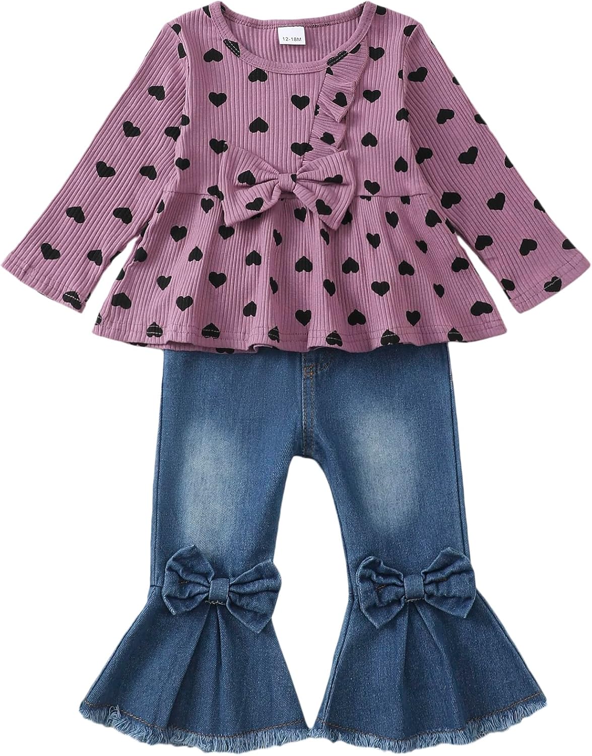 This adorable baby girl outfit is perfect for your little fashionista! The long-sleeve top features a cute heart or flower print pattern in a warm brown/white/blue/pink/green hue, with a stylish bowknot front detail. Pair it with the trendy ruffle-trim frayed denim jeans for a look that’s both comfy and chic. The flared leg design adds a playful touch, while the ruffles along the legs offer a touch of whimsy. Whether for a birthday celebration, family gathering, Christmas, Valentines day outfit or just a fun day out, this two-piece outfit set is sure to make your little one stand out from the crowd. Crafted from high-quality materials, it’s designed for all-day comfort and easy care. Available in sizes ranging from baby girl clothes 12-18 months, 18-24 month girl clothing, 2-3 year old girl outfit, 3-4 year old girl clothes, this outfit is a must-have for your little girl’s fall and winter wardrobe.