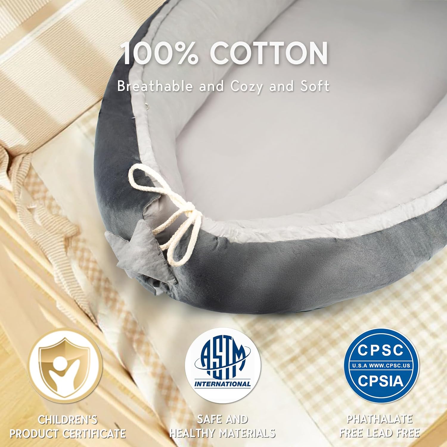 πππ: Our baby nest is double sided usable design, one side is cotton and the other side is velvet, suitable for use in different seasons. It mimics the warmth of a mother’s womb, providing babies with a safe, cozy and comfortable sleep environment, 360 degree snuggle and smooth baby. This co sleeping nest has an adjustable elastic cord to adjust the size and shape, which is perfect for babies 0-24 months.