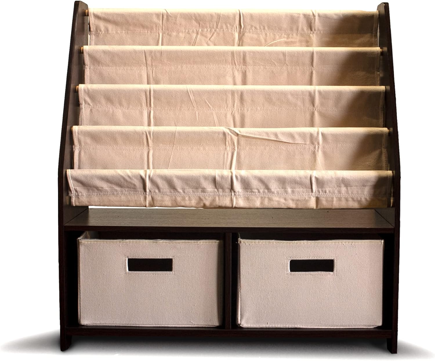 Front Facing Kids Bookcase makes it easy to spot a book. Depending on book sizes, the sling can hold 20-30 books. Two storage bins underneath for misc items.