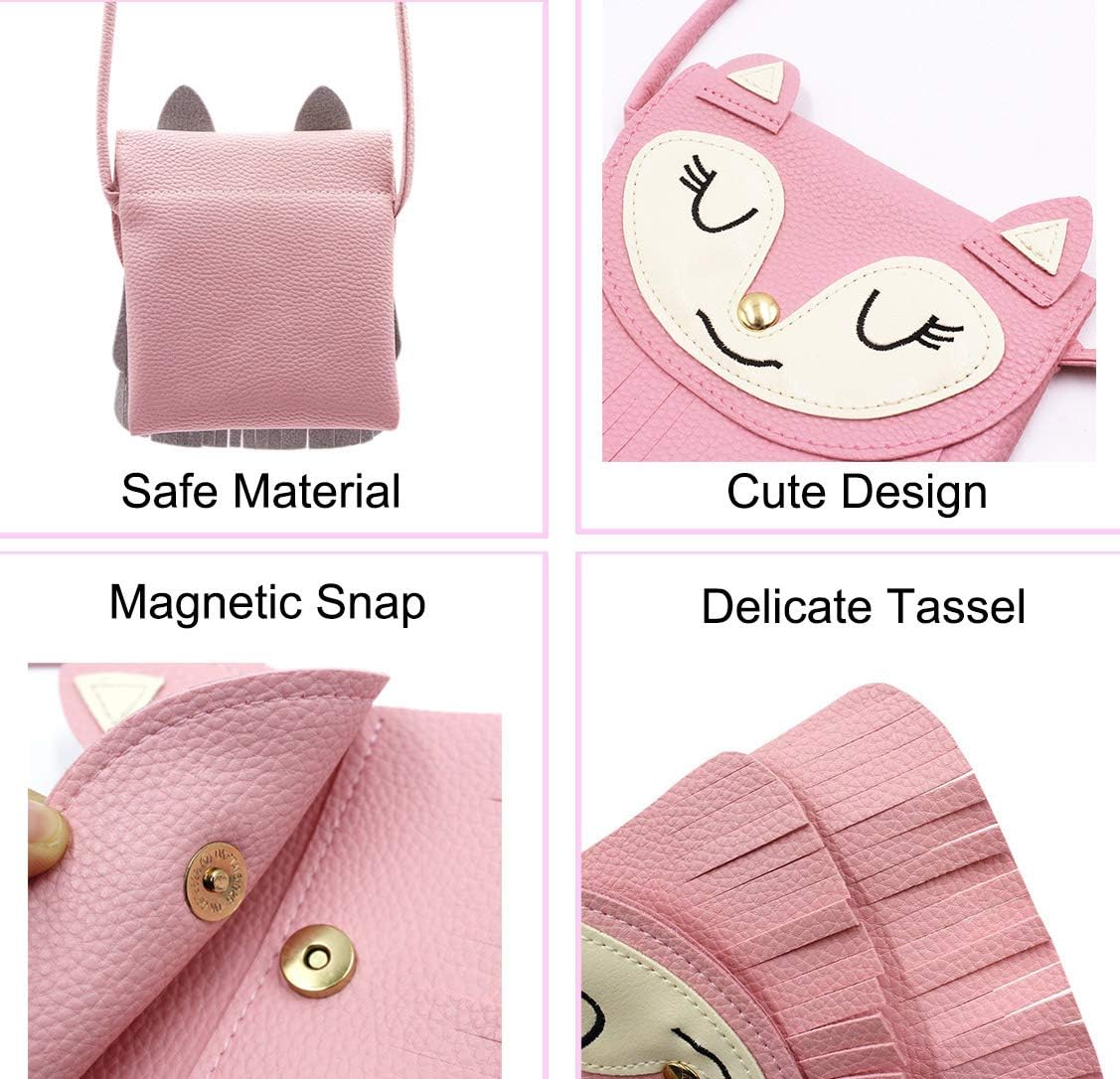 Made with toxin free materials, encouraging fun and safe to use.Customized size, it is suitable for 4-12 years old girls to take her small items.Snap button closure, easy for opening and closing while adding the security of the stuff inside.The shoulder strap can be adjusted by tying a knot, it makes it easy for kids to either wear it as a cross body bag, or on their shoulder.Adorable cat style and beautiful fringe tassel, every girl will love it! This is a nice present for your little princess.